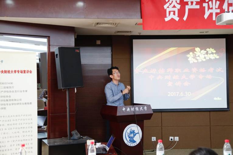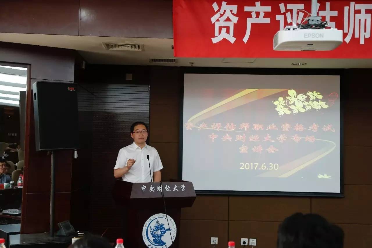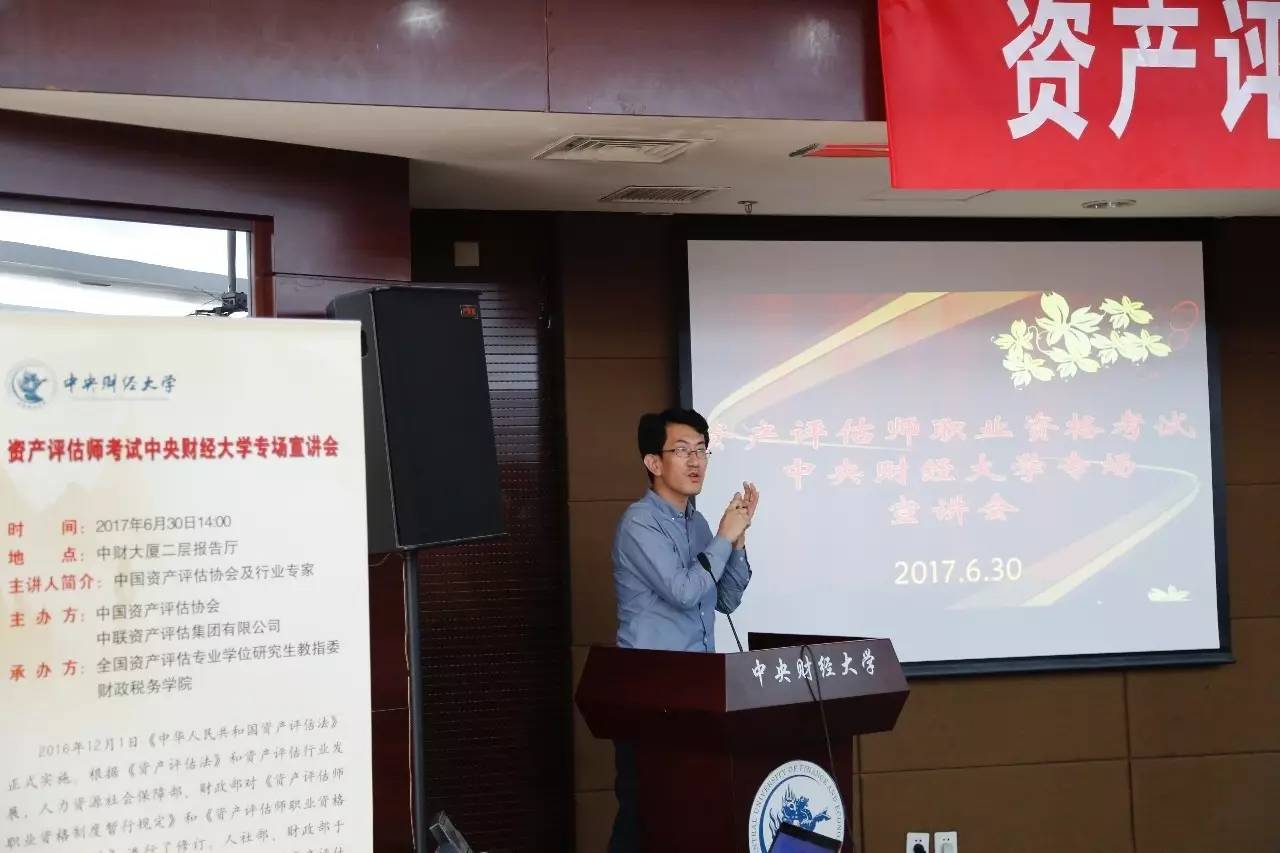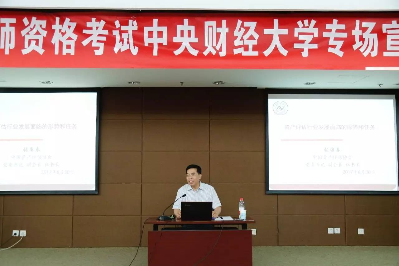 2017年6月30日,由中国资产评估协会、中联资产评估集团有限公司主办,开云网页版入口中国有限公司承办的“资产评估师考试中央财经大学专场宣讲会”在中财大厦二层报告厅成功举办。中国资产评估协会秘书长张国春、副秘书长杨松堂、培训总监赵金娥,中联资产评估集团有限公司董事长范树奎、合伙人兼副总裁邓艳芳、合伙人兼总裁助理吴晓光、高级经理刘晨,中央财经大学副校长李俊生教授、财政税务学院院长白彦锋教授、财政税务学院党委副书记宋立岩、副院长肖鹏教授、副院长任强教授以及财政税务学院、会计学院的100余名师生参加了本次宣讲会。宣讲会由开云网页版入口中国有限公司院长白彦锋教授主持。