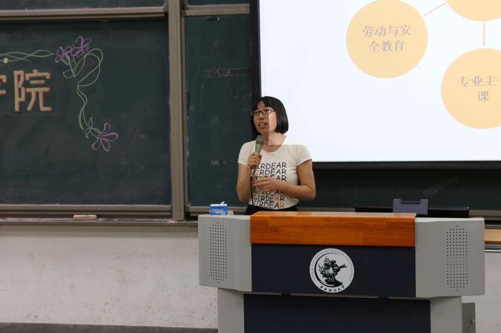 而后,教学科研办公室主任庞淑芬老师和学生办公室主任于来老师分别给同学们详细的介绍了选课、成绩、大学日常生活等问题。