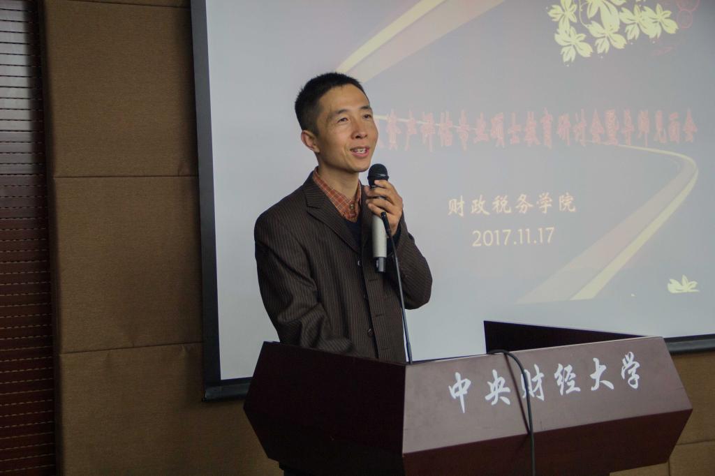 中央财经大学副校长李俊生教授致辞。首先,李俊生副校长代表中央财经大学对各位校外导师的到来表示诚挚的欢迎,对导师们为我校资产评估专业硕士教育提供的支持和帮助表示衷心地感谢。李俊生教授总结了资产评估学科的发展现状,认为学好资产评估要从三个方面入手。第一,要注重基础,在校期间要把握时间,努力扎实理论、夯实基础,将学科知识学透,为今后投身评估事业做好准备;第二,要注重理论和实践相结合,在与校外导师的学习中加深对理论的理解、对资产评估学科的认识,提高自己的实践能力;第三,李俊生教授强调,随着市场的不断扩大,资产评估行业的发展更加离不开学术理论的进步,李俊生教授号召在座的各位导师与学生积极投身到资产评估理论的研究中,大家集思广益,互相学习,为资产评估学科理论的建设与发展贡献智慧。