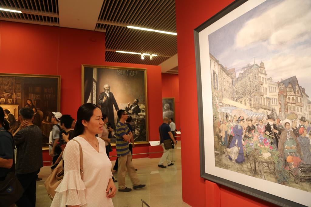 展厅中,一面“顶天立地”的巨大书墙格外引人注目,里面摆满了成百上千本《共产党宣言》,囊括各个时期、各国语言的不同版本。不同的封面,同样的内容;不同的装订,同样的智慧。老师同学们纷纷驻足观看,感受马克思主义的光芒和生命力,直面“真理的力量”。