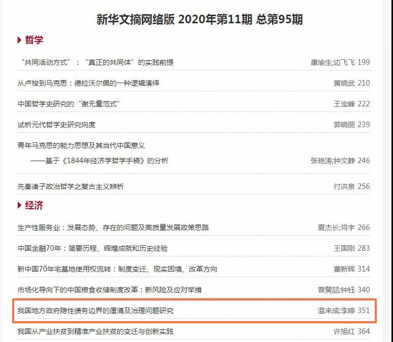 近日,财税学院温来成教授和学生李婷在《中央财经大学学报》发表的论文《我国地方政府隐性债务边界的厘清及治理问题研究》被《新华文摘网络版》转摘。