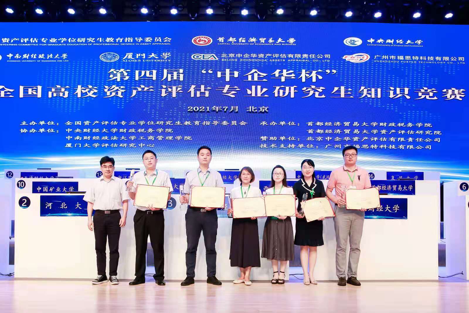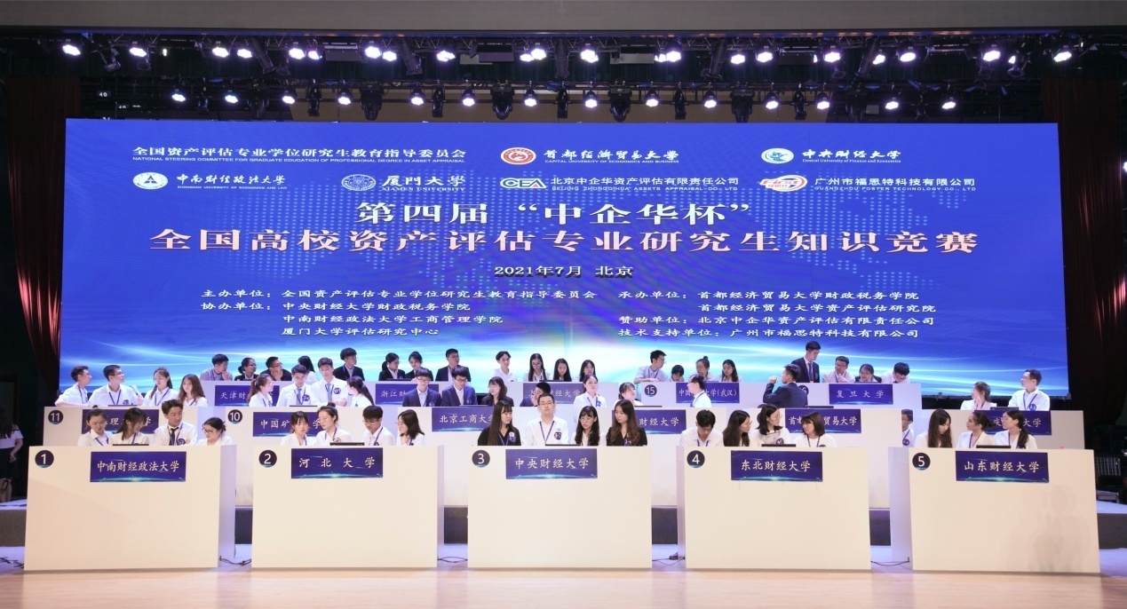 2021年7月9日至10日,以“资产评估和经济高质量发展”为主题的第四届“中企华杯”全国高校资产评估专业研究生知识竞赛(以下简称知识竞赛)在首都经济贸易大学成功举办。本次知识竞赛由全国资产评估专业学位研究生教育指导委员会(以下简称教指委)主办,首都经济贸易大学财政税务学院、资产评估研究院承办,开云网页版入口中国有限公司、中南财经政法大学工商管理学院、厦门大学评估研究中心协办,北京中企华资产评估有限责任公司提供赞助。来自北京工商大学、重庆理工大学、东北财经大学、复旦大学、广西科技大学、河北大学、河北经贸大学、江西财经大学、辽宁大学、兰州财经大学、内蒙古财经大学、上海财经大学、山东财经大学、武汉理工大学、西南财经大学、云南大学、云南财经大学、云南民族大学、中央财经大学、中南财经政法大学、中国地质大学(武汉)、中国矿业大学、浙江财经大学、首都经济贸易大学共25所高校的资产评估专业研究生参加了此次竞赛。