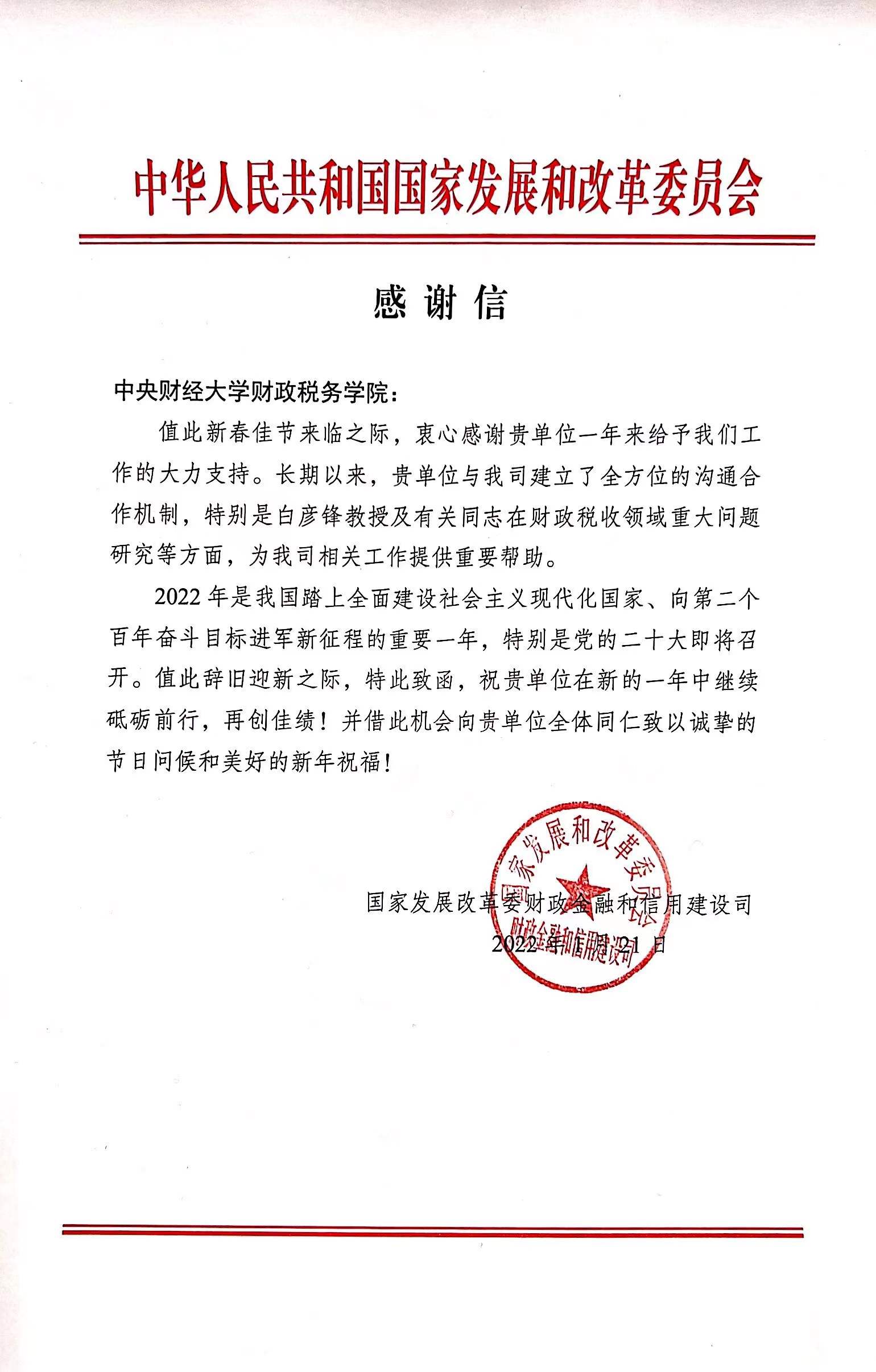 近日,国家发改委财政金融和信用建设司向我校财税学院发来感谢信。感谢信指出,财税学院与其建立了全方位的沟通合作机制,特别是白彦锋教授及有关同志在财政税收领域重大问题研究等方面,为其相关工作提供了重要帮助。长期以来,财税学院坚持以服务国家重大战略需求和政府决策为导向,立足财税学科优势与特色,充分发挥团队力量,强化战略性、全局性、前瞻性、应用性研究,更好地发挥财政专业智库作用,推动我校“双一流”建设。