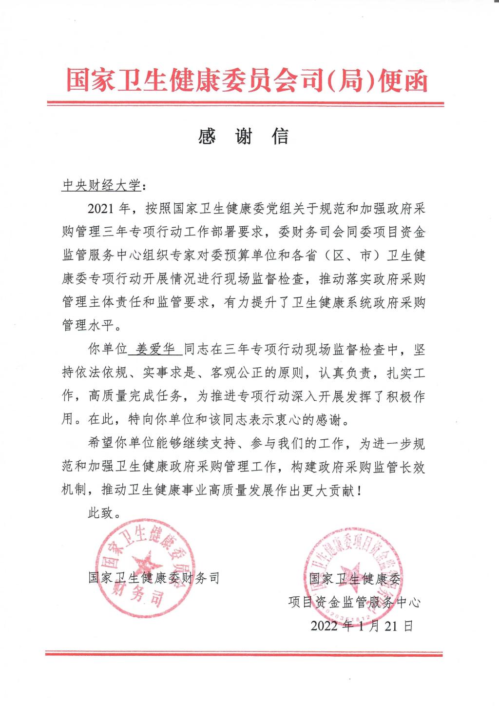 近日,国家卫生健康委员会财务司和项目资金监管服务中心向我校发来感谢信,对我校财政税务学院姜爱华教授团队积极参与国家卫生健康委政府采购三年专项行动工作表示感谢。
