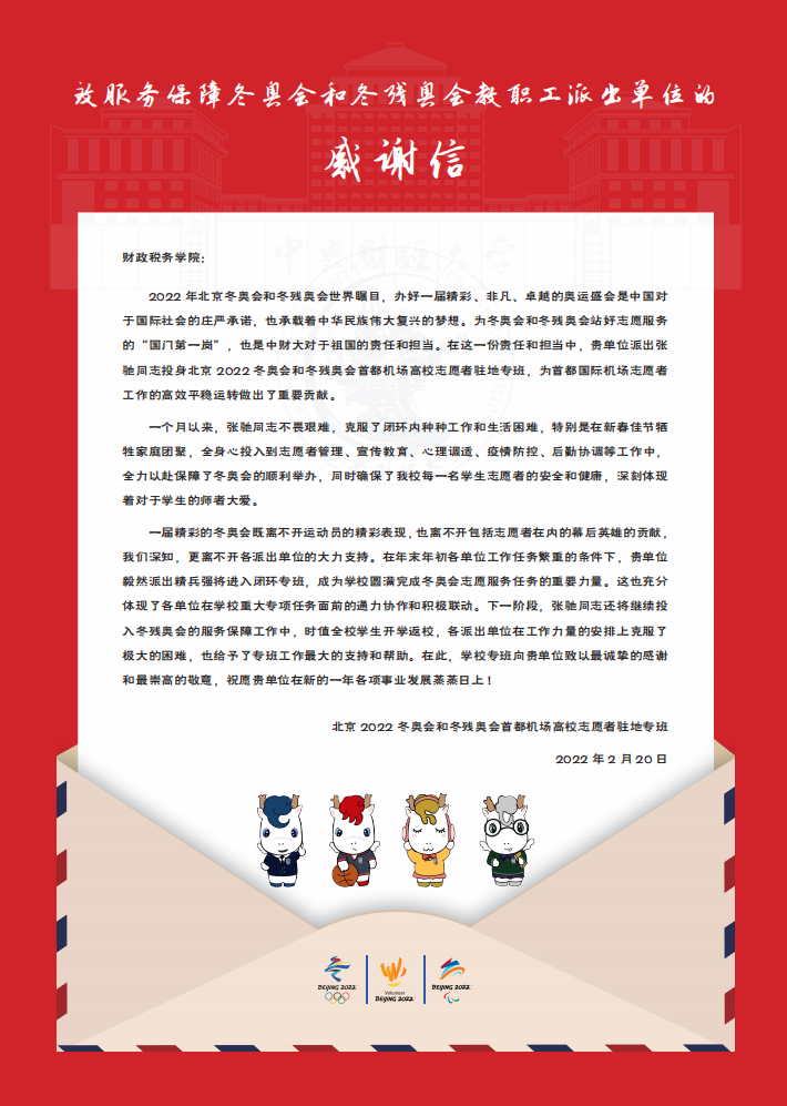 2022年2月20日,北京2022冬奥会和冬残奥会首都机场高校志愿者驻地专班给我院发来感谢信,对我院全力支持与配合2022冬奥会和冬残奥会首都机场高校志愿者驻地专班工作,特别是我院团委书记张驰同志在本次首都机场志愿服务期间做出的应有贡献表示感谢。