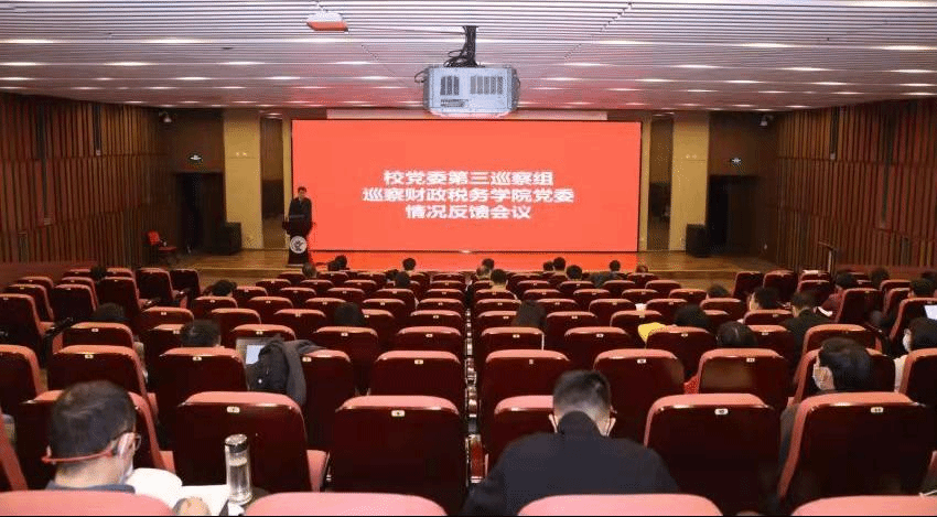 2022年3月16日下午,校党委第三巡察组向财政税务学院反馈巡察情况。巡察反馈采取个别反馈和集中反馈相结合的形式进行,校党委巡察工作领导小组副组长、校党委副书记、纪委书记单际国主持召开个别反馈会议并出席集中反馈会议,对巡察整改工作提出要求。巡察组组长吕杰向财政税务学院师生员工反馈巡察情况,财政税务学院党委书记樊勇表态发言,党委副书记、院长白彦锋主持集中反馈会议。巡察组全体成员,党委组织部、党委巡察工作办公室有关负责人,财政税务学院全体教职工、学生代表参加会议。