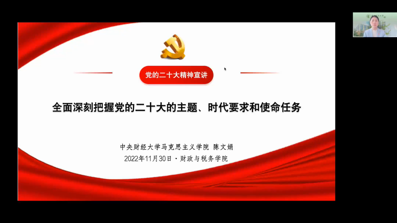 为全面深刻把握党的二十大精神,落实中共中央财经大学委员会学习宣传贯彻党的二十大精神工作方案要求,引导学院师生踔厉奋发、勇毅前行,11月30日下午,我院思政讲堂邀请了我校马克思主义学院党总支书记陈文娟教授讲授题为《全面深刻把握党的二十大的主题、时代要求和使命任务》的线上专题讲座。学院师生党员、2022年基础团校学员参加学习。讲座由学院党委书记樊勇主持。