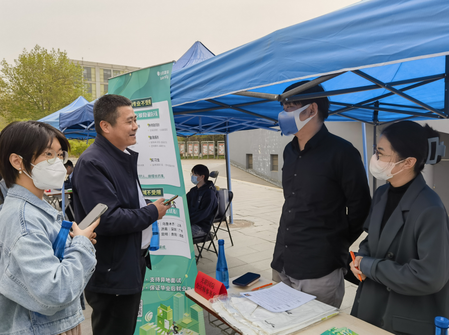 为深入学期贯彻党的二十大精神和习近平总书记关于做好高校毕业生就业创业工作的重要批示指示精神,响应党中央、国务院“稳就业”“保就业”决策部署,拓展“万企进校园”渠道,落实学校“抢创春招关键期,全力攻坚促就业” 行动,2023年4月13日上午,2023年春季校园专场招聘会在沙河校区顺利举办,本次活动由财政税务学院主办、体育经济与管理学院协办。院党委副书记陈士平、毕业班辅导员徐燕妮、团委书记张驰到场指导。