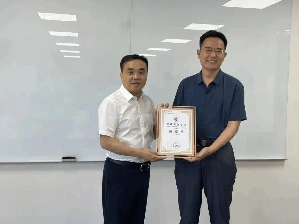 樊勇院长介绍了我院人才培养特色和成效,并感谢智方圆事务所对于财政税务学院人才培养工作的支持,尤其是对经济有困难毕业生的接受和培养,与学院保持良好的互动并建立了深厚的友谊。最后樊勇院长颁发“贡献奖”奖牌以表示智方圆税务师事务所和王冬生董事长对学院人才培养工作的贡献。