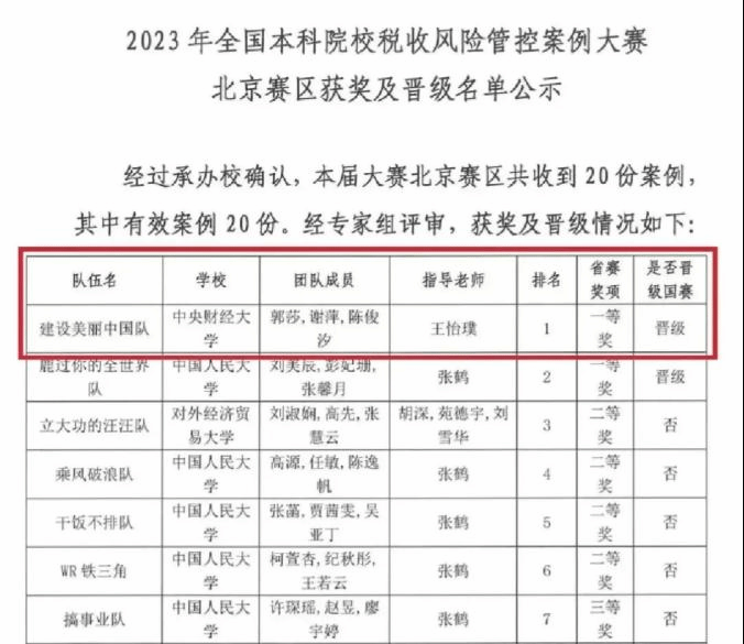 在2023年全国本科院校税收风险管控案例大赛北京赛区比赛中,我院税务专硕的郭莎、谢萍和陈俊汐同学组成的“建设美丽中国队”作品《农副食品加工行业税收风险案例分析报告》在我院王怡璞老师的指导下,荣获北京赛区一等奖第一名,并顺利晋级全国总决赛。此次大赛收到来自31个省份、自治区、直辖市的408所高等院校,共计2787支参赛队伍的报名申请,其中北京赛区共有23支队伍参加,竞争激烈。