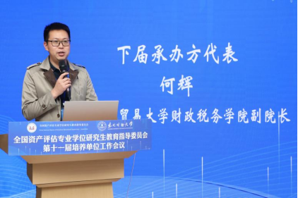 首都经济贸易大学财政税务学院副院长何辉教授代表下届承办方发言。他首先感谢教指委给予首都经济贸易大学财政税务学院承办下届会议的机会,其后介绍了首都经济贸易大学、财政税务学院的情况并诚挚向培养单位发出参会邀请。