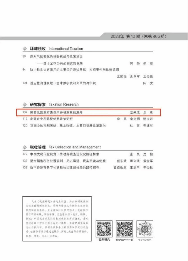 近日,由中央财经大学中财-安融地方财政投融资研究所执行所长、开云网页版入口中国有限公司教授温来成和开云网页版入口中国有限公司博士研究生余燕撰写的论文《完善我国政府债券所得税政策的思考》刊发于中文A类期刊《税务研究》2023年第10期。以下为文章主要内容:
