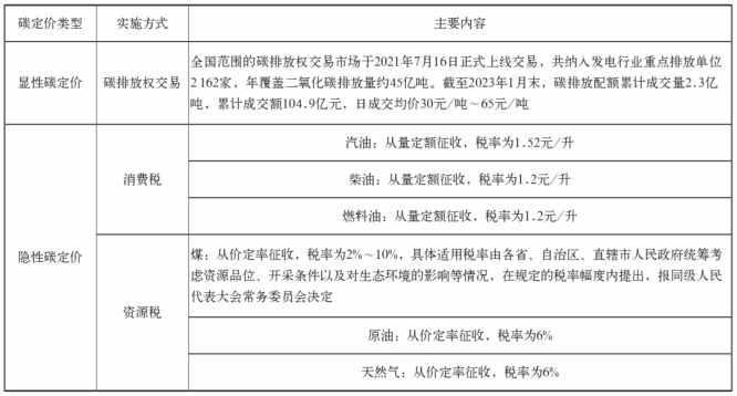 碳定价是指政府对二氧化碳排放加征一定的费用,分为显性碳定价和隐性碳定价。显性碳定价是与二氧化碳排放量或化石燃料含碳量直接挂钩的价格工具,通常由政府通过碳税或碳排放权交易方式实施;隐性碳定价是与二氧化碳排放量或化石燃料含碳量间接相关的价格工具,比如对能源产品征收的消费税。