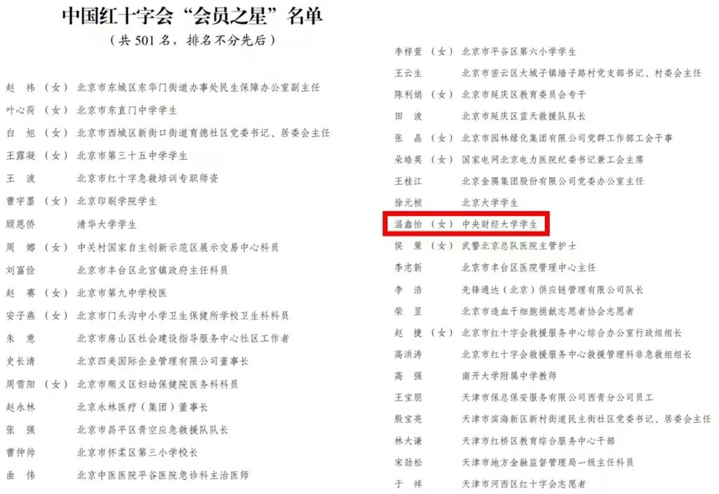 作为红十字会的一员,温鑫怡积极践行社会主义核心价值观,热心公益和红十字事业,大力弘扬“人道、博爱、奉献”的红十字精神,在志愿服务、无偿献血、疫情防控、山区支教等行动中发挥示范作用,带领我校红十字会学生骨干为北京高校红十字事业添砖加瓦。
