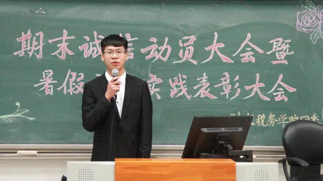 接下来进行的是财政税务学院党委副书记宋立岩老师讲话环节。宋立岩老师首先对《学生手册》的重要性做了强调,要求同学们认真阅读《学生手册》的相关内容,对学校规章有清晰的了解。宋老师对期末诚信考试向大家做了动员。宋老师结合相关事例介绍了考试作弊后果的严重性,希望大家引以为戒。宋老师还指出,两院合并之后从未发生过作弊行为,希望同学们继续保持良好风气。在学习上存在困惑可以与辅导员、班主任和同学们进行交流,寻求解决办法。宋老师还强调了安全问题。提醒同学们在社会实践和实习的过程中提高警惕,远离传销等违法活动。在外出时要注意人身财产安全,注意与家人、学校保持联系。最后,宋老师对同学们寄予美好期望,预祝大家在期末考试中取得满意的成绩。
