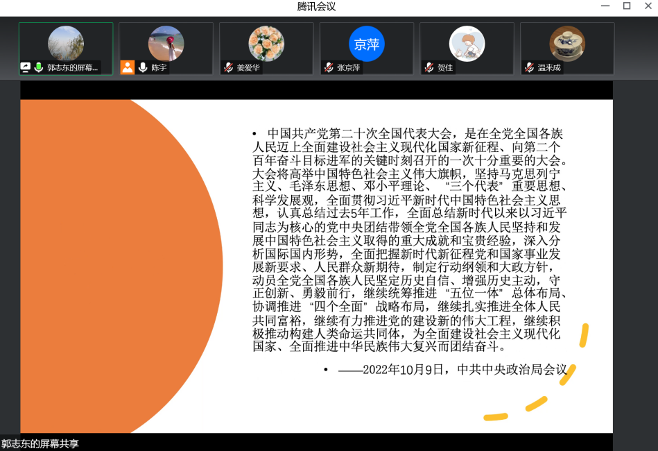 党的二十大召开在即,根据学校文件精神以及学院党委工作安排,国际税收系党支部与财政管理系党支部于2022年10月10日晚7:00通过腾讯会议联合举办了迎接党的二十大主题宣传教育活动。会议的议题有三项,一是国际税收支部郭志东老师报告党史学习专题《历史自信与中国特色社会主义道路》 ;二是支部党员就“强国有我新征程,喜迎党的二十大”展开讨论;三是财政管理支部书记姜爱华老师做会议总结。