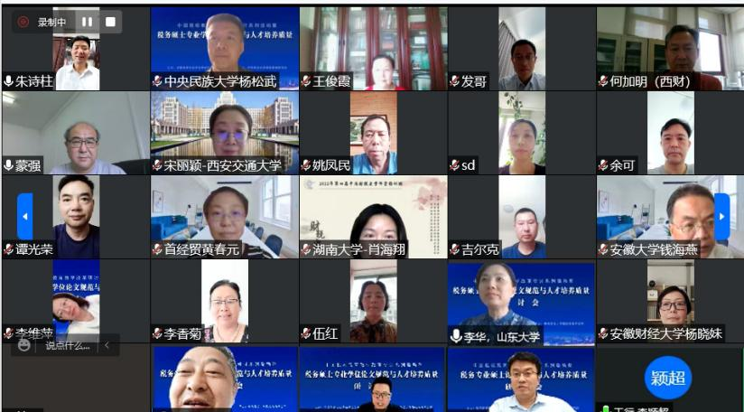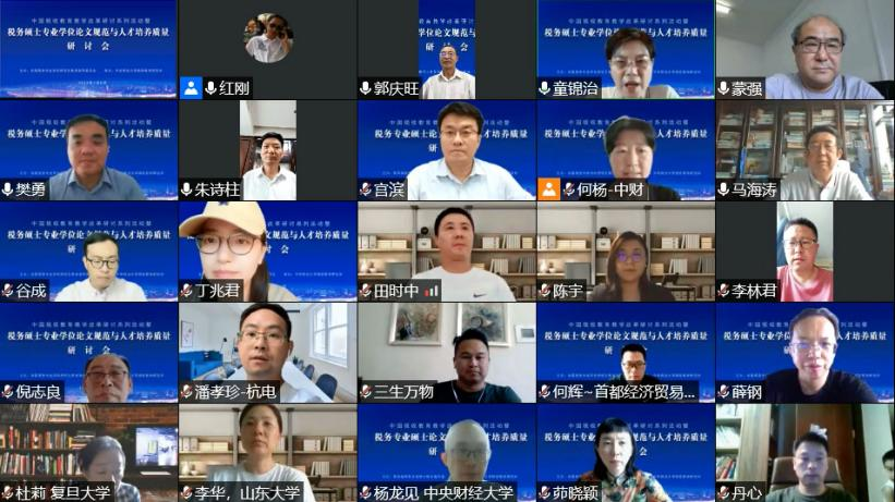 2022年7月8日,由全国税务专业学位研究生教育指导委员会主办,中央财经大学税收教育研究所承办的“中国税收教育教学改革研讨系列活动暨税务硕士专业学位论文规范与人才培养质量研讨会”,通过线上会议形式成功召开。来自中国人民大学、厦门大学、复旦大学、首都经济贸易大学、中央财经大学、湖南大学、山东大学、西安交通大学、中南财经政法大学、西南财经大学、中国社会科学院、南京财经大学、安徽大学、广东财经大学、贵州财经大学、内蒙古财经大学等全国多家高校及科研所的代表,共计230余人参加了会议。