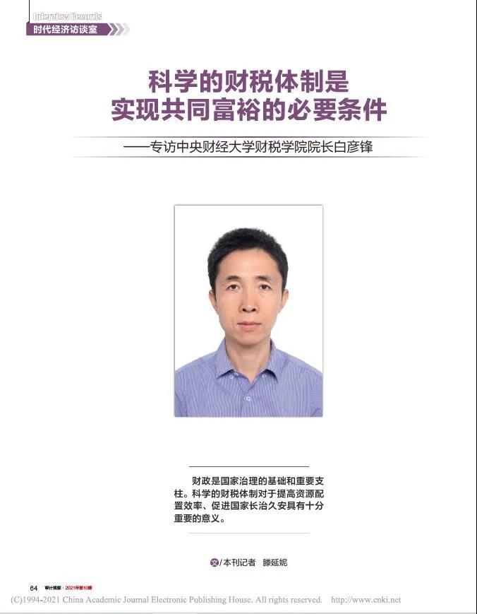 2021年10月,开云网页版入口中国有限公司院长、中国财政发展协同创新中心主任白彦锋教授就“科学的财税体制是实现共同富裕的必要条件”专题,接受了《审计观察》的采访。全文如下: