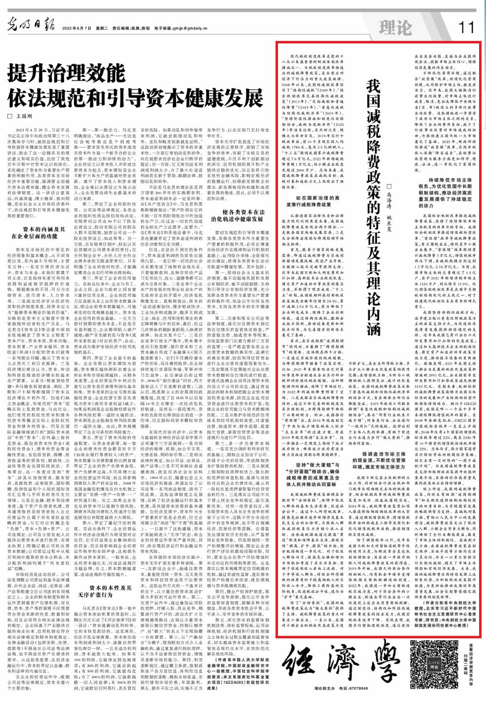 6月7日,《光明日报》理论版刊登了中央财经大学党委副书记、副校长马海涛教授和中国财政发展协同创新中心姚东旻教授发表的署名文章——《我国减税降费政策的特征及其理论内涵》。
