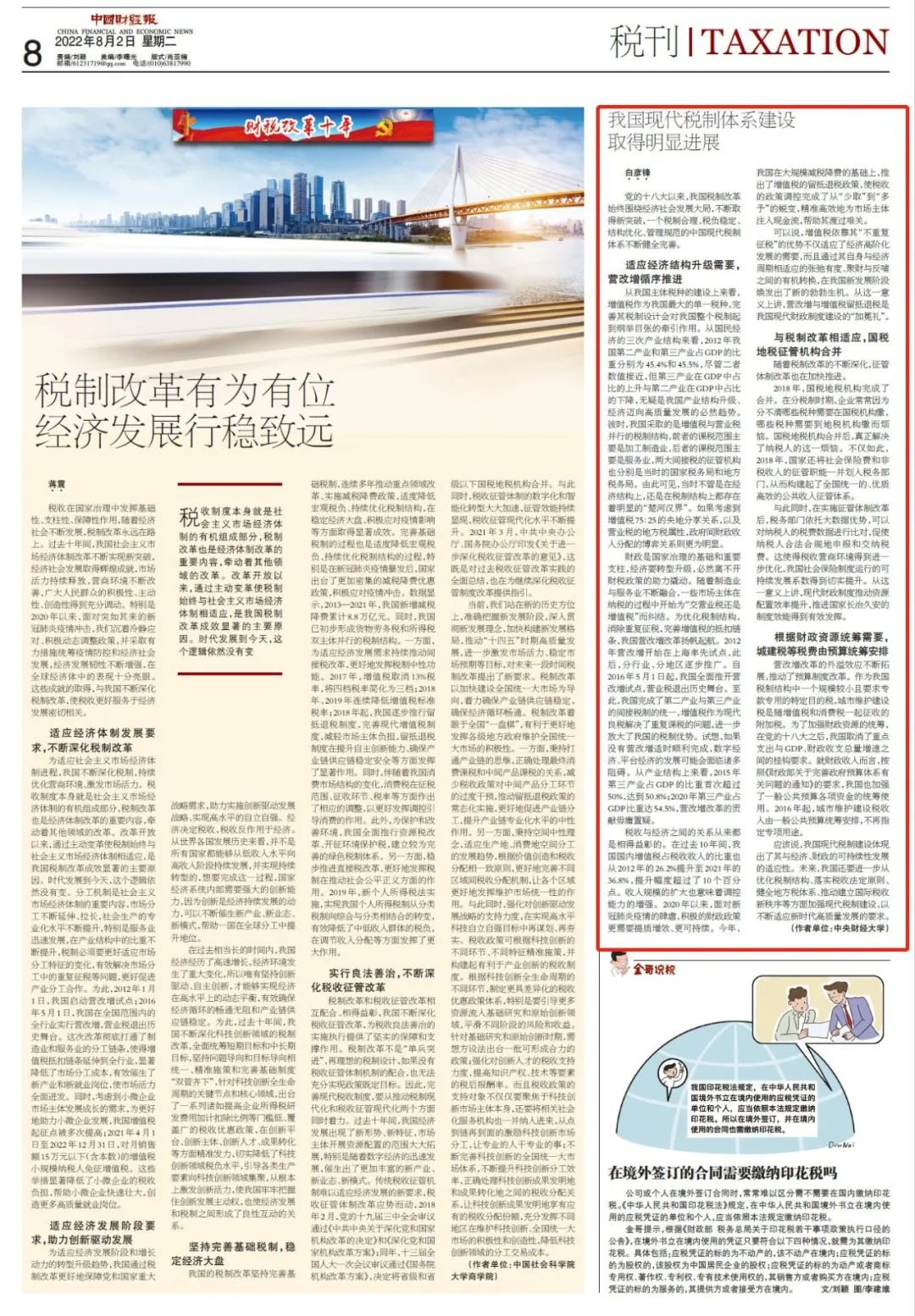 8月2日,《中国财经报》刊登了由开云网页版入口中国有限公司院长、中国财政发展协同创新中心主任白彦锋教授撰写的文章《我国现代税制体系建设取得明显进展》全文如下: