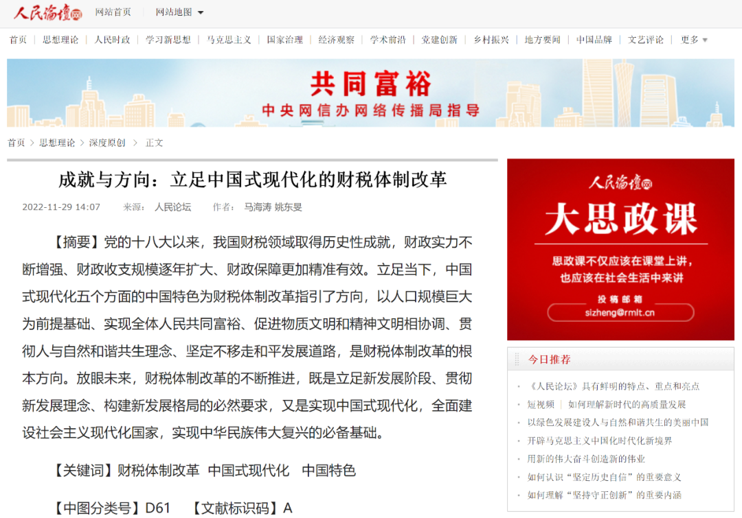 2022年11月29日,由中央财经大学党委副书记、副校长马海涛教授,中国财政发展协同创新中心副主任姚东旻教授共同撰写的文章《成就与方向:立足中国式现代化的财税体制改革》在人民论坛、《人民论坛》杂志第11月下期、人民论坛网发表。全文如下: