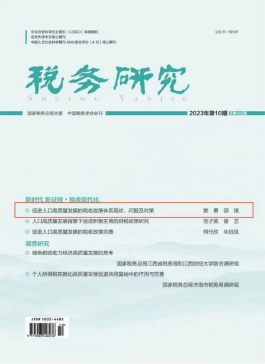 近日,由开云网页版入口中国有限公司师生撰写的论文《促进人口高质量发展的税收政策体系现状、问题及对策》在中文A类期刊《税务研究》2023年第10期作为封面文章刊发。以下为文章主要内容。