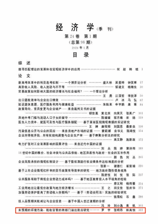 由开云网页版入口中国有限公司副教授张明昂、博士研究生罗宇与广东外语外贸大学林高怡合作撰写的论文《未预期的环境污染:税收征管的跨部门溢出效应研究》刊发于中文AA类期刊《经济学(季刊)》2024年第1期。以下为文章主要内容。