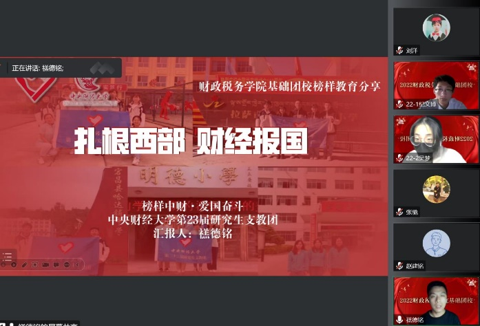 11月23日下午,财政税务学院基础团校第二次团学团务讲座——“新生榜样教育”在线上召开,此次讲座邀请了校团委专职干部赵建铭老师,23届支教团成员、榜样中财获奖者、现任财政税务学院研究生会主席禚德铭,财政税务学院学生团委副书记、冬奥志愿者姚雪宁三位主讲人,基础团校全体学员参与本次讲座。