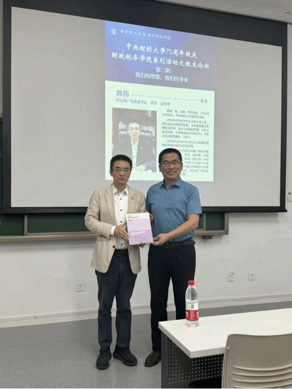 2024年5月16日晚,财政税务学院在沙河二教102教室举行了以“我们的理想、我们的事业”为主题的校友论坛活动,本次邀请到的是现任信达地产党委副书记、董事、总经理郭伟校友,活动由学院党委书记肖鹏主持。